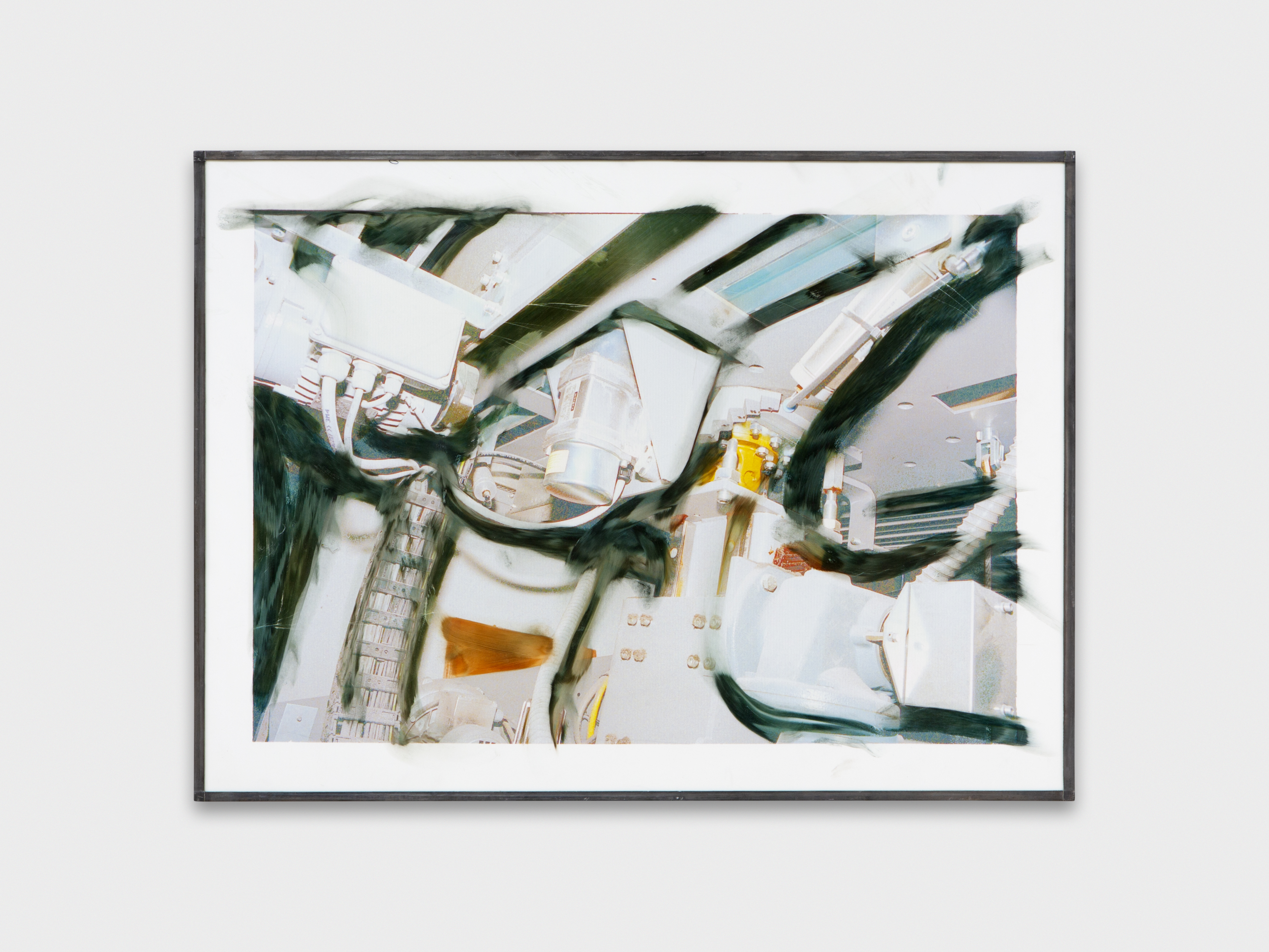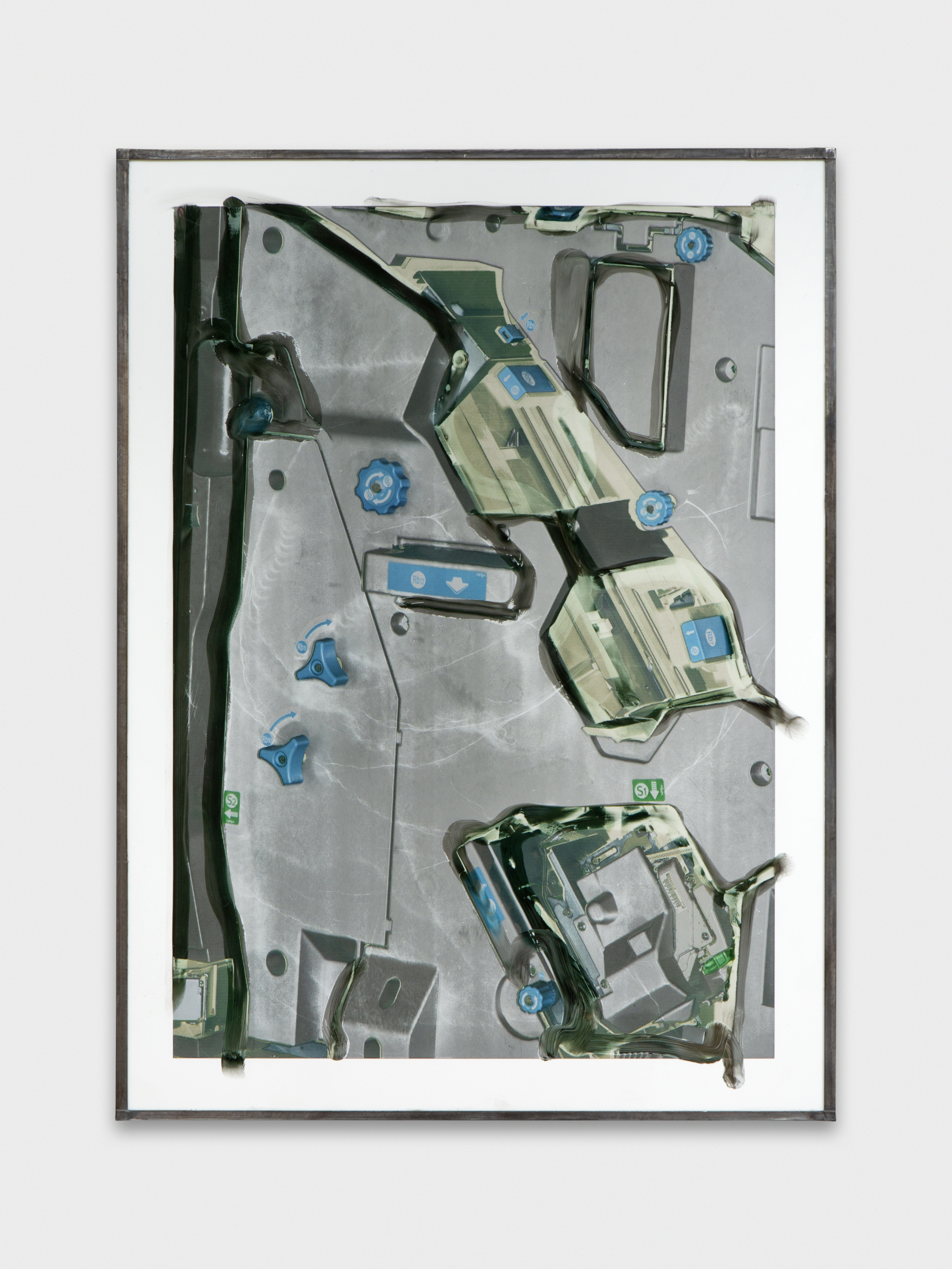 Inkjet print on plastic foil, fingertips intervention, handmade lead frame. 42 × 31 cm