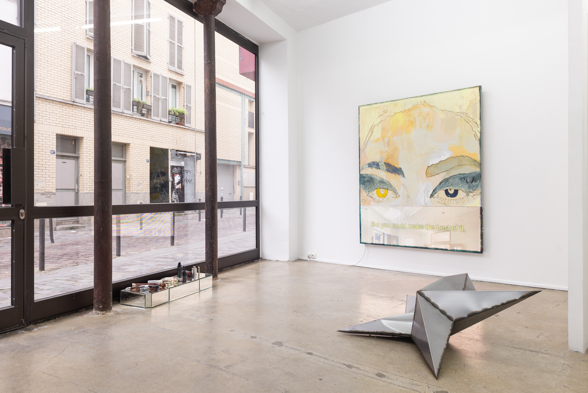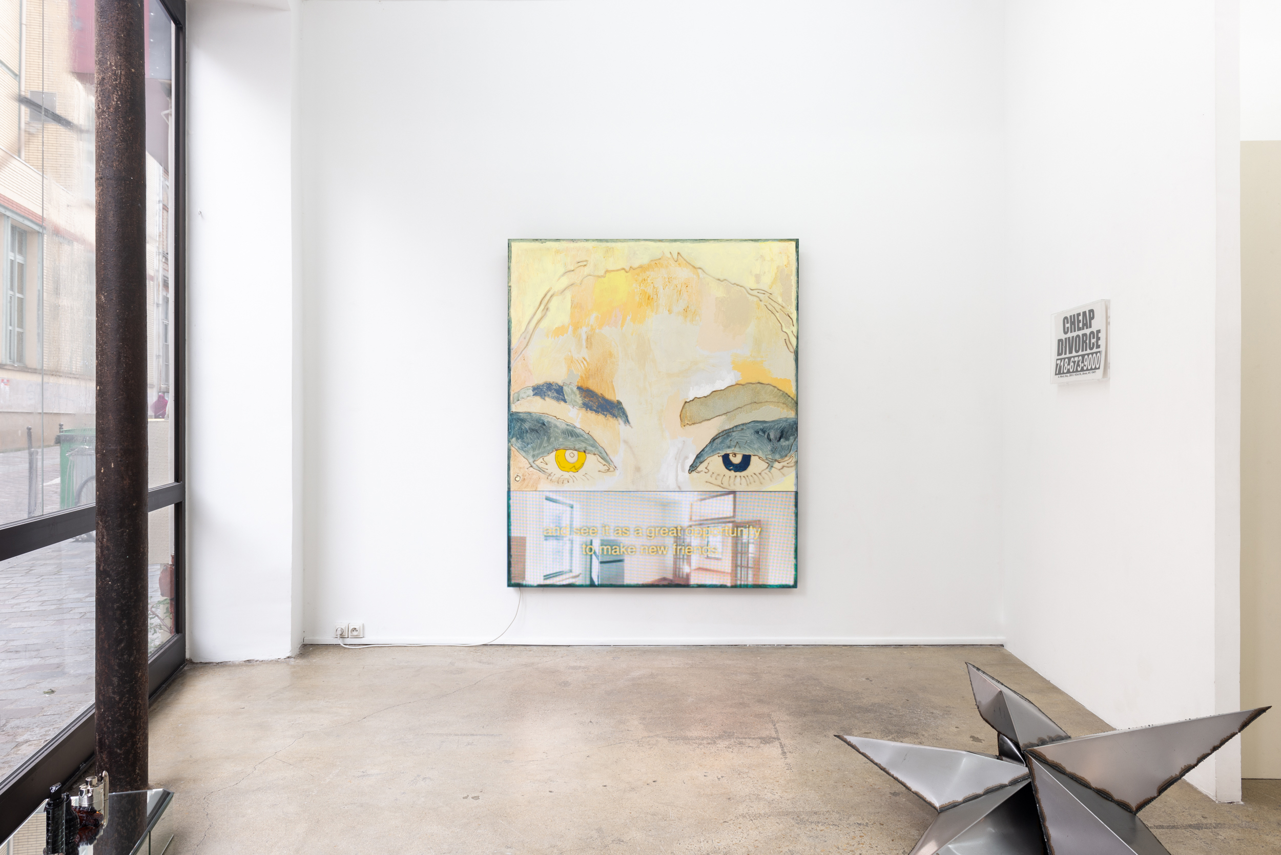 Acrylic, oil on canvas, LED panels, media player, video. 180 × 150 cm
