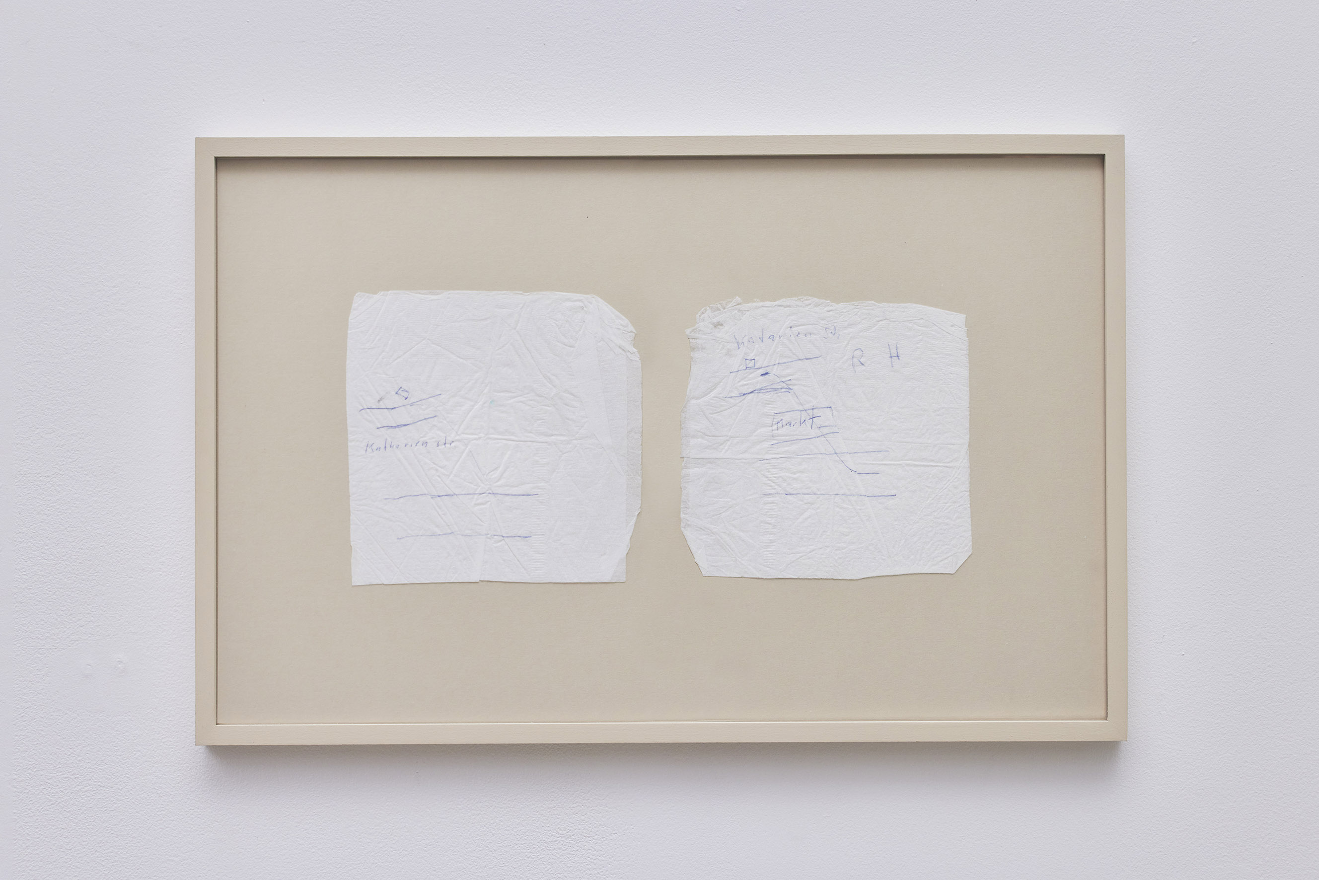 Two plans showing the same address drawn on paper napkins by a hotdog seller three days apart, wooden frame. 31 × 48 cm