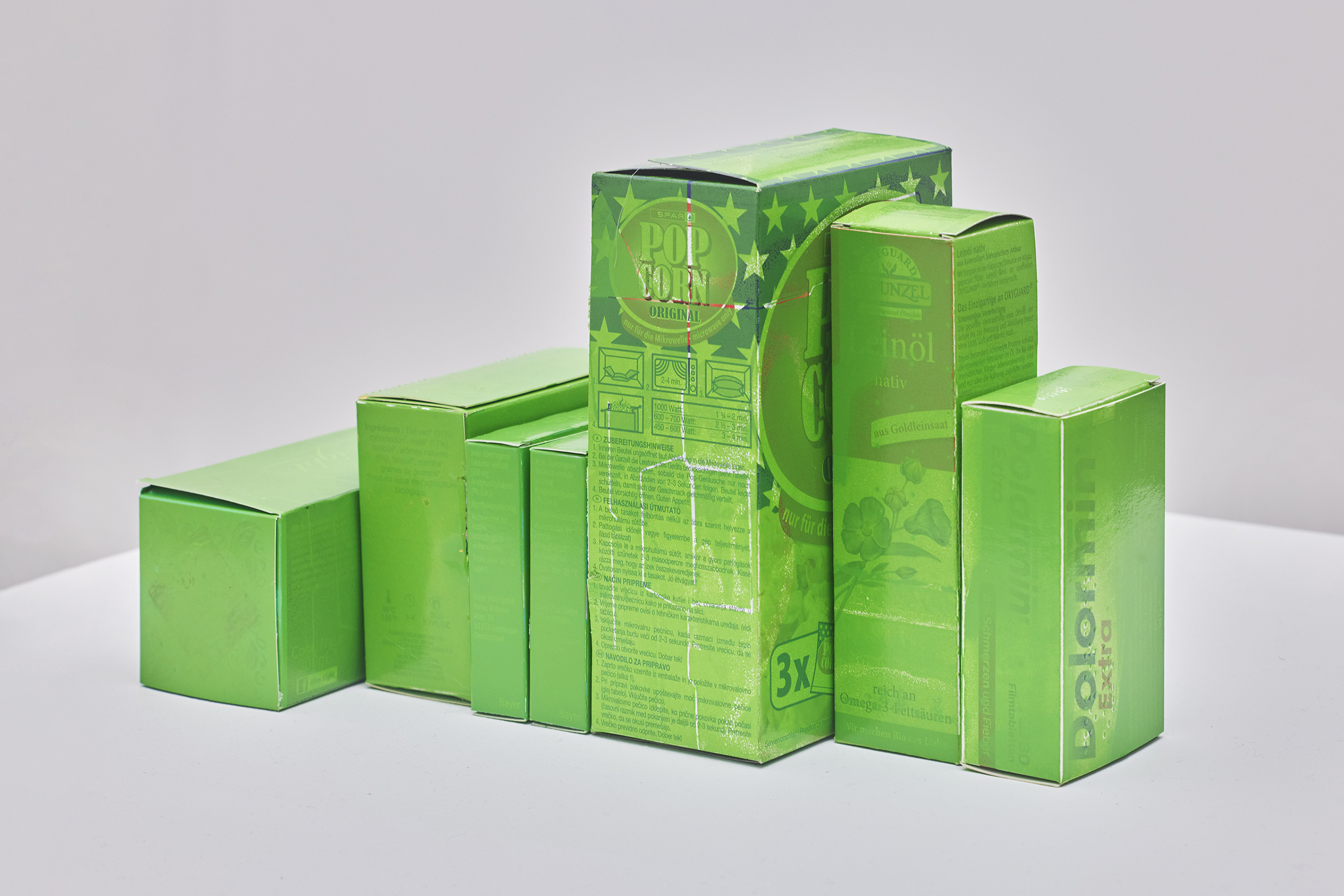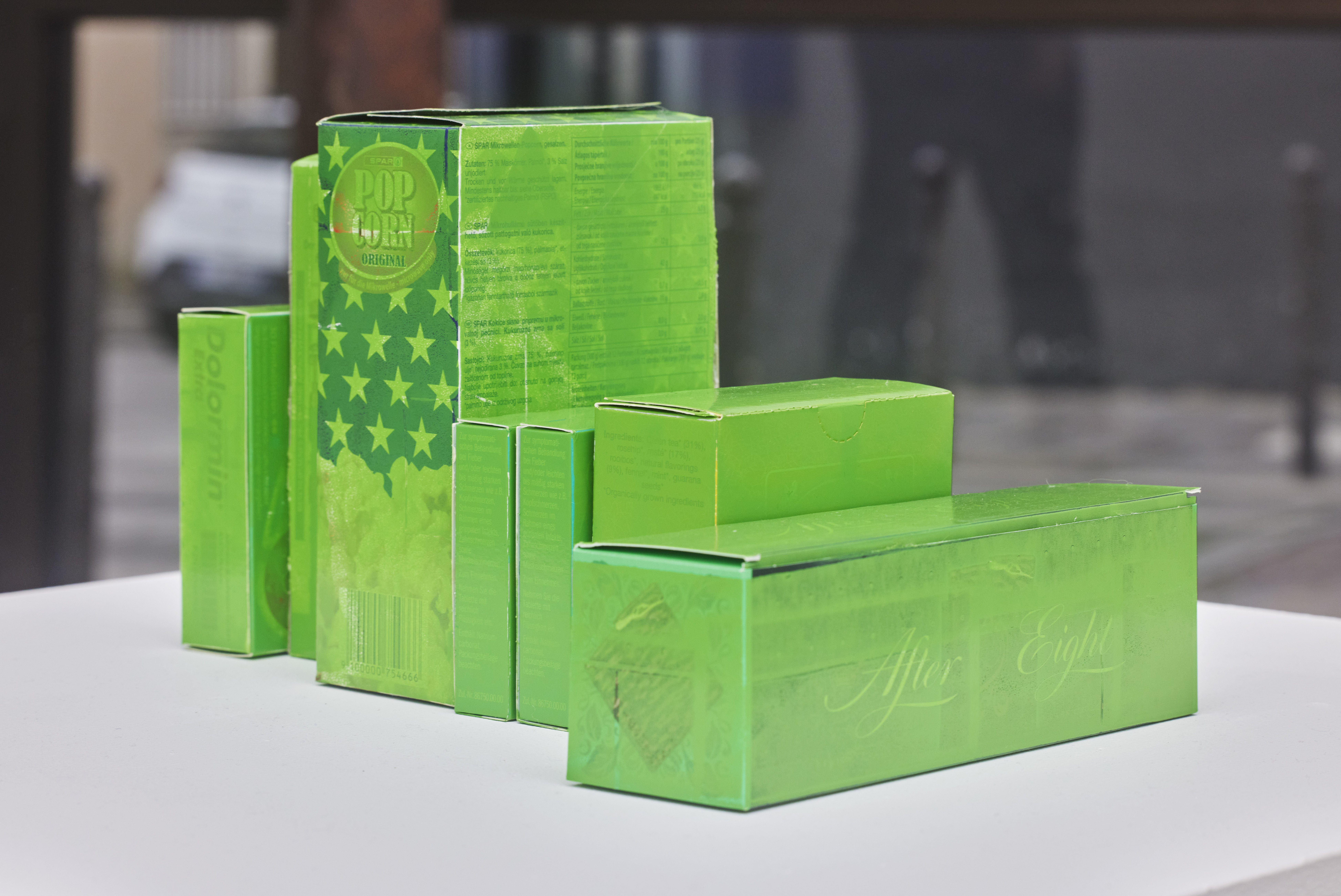 Silkscreen ink on packaging boxes. 17 × 30 × 19 cm
