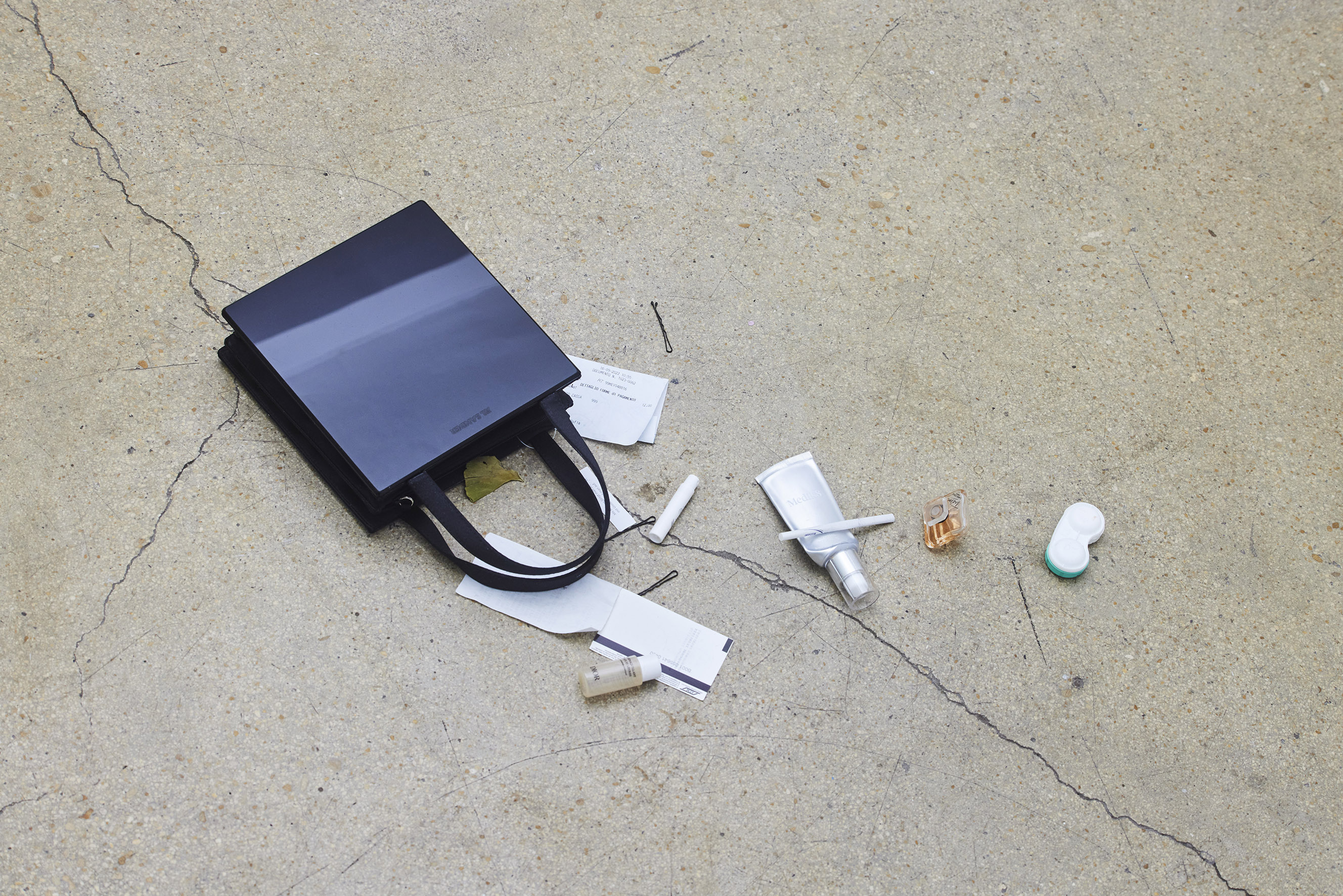 Borrowed handbag content, spoken text found on online forum, piano music by Justin Raym. Variable dimensions