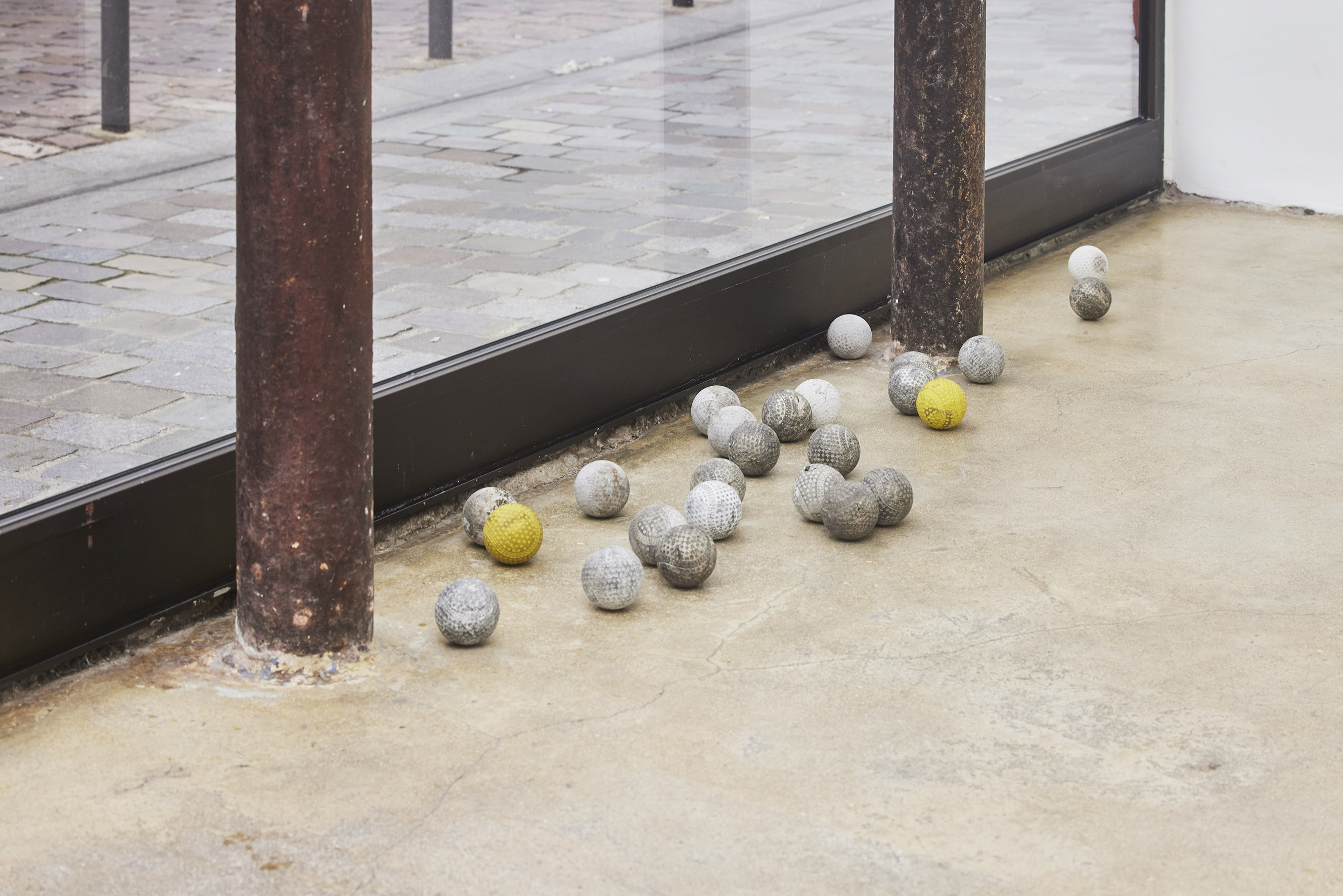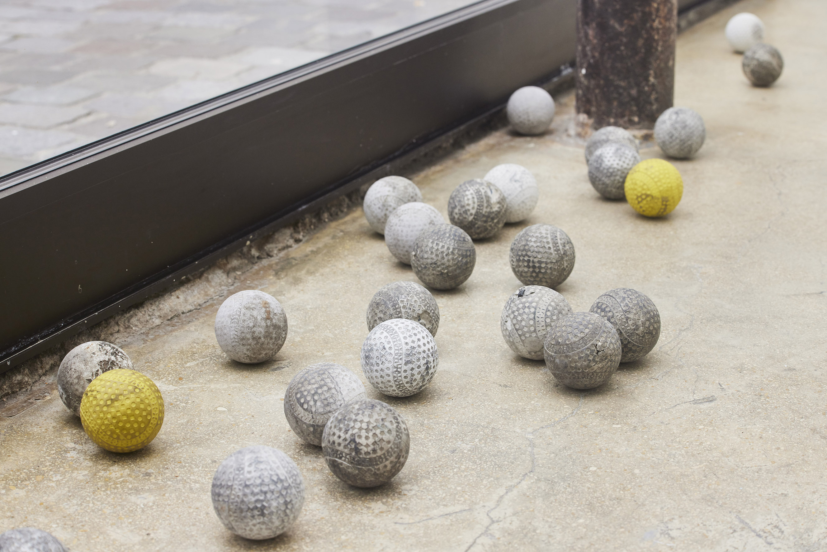 Ensemble of twenty-five found and shipped Japanese practice rubber baseballs. Variable dimensions