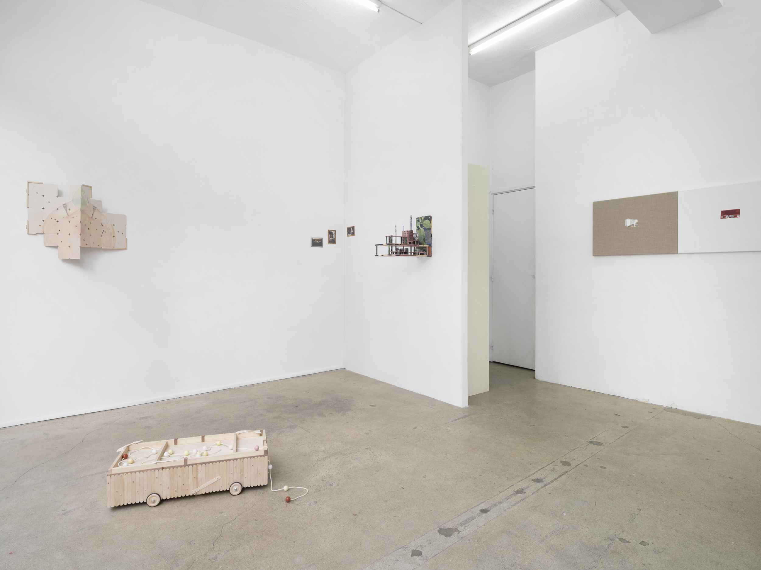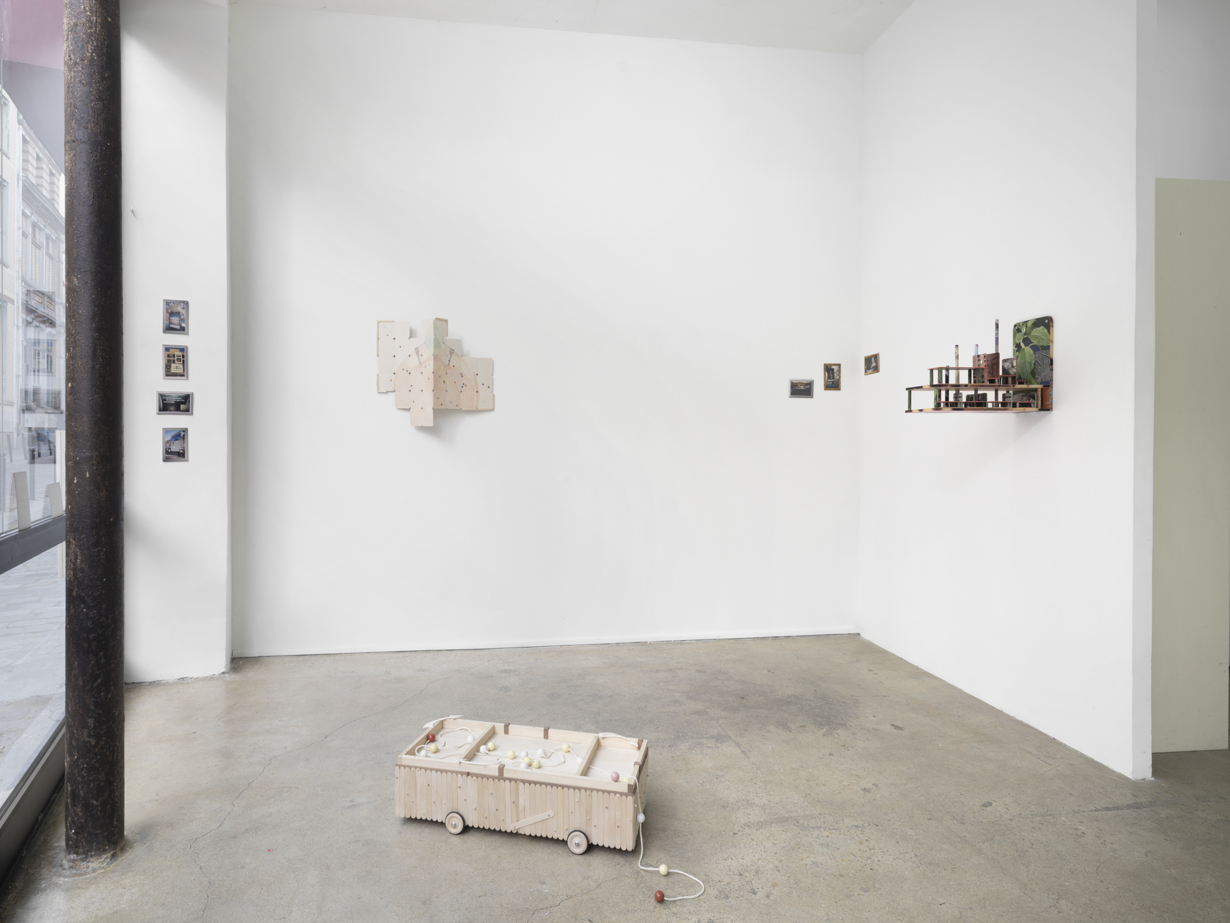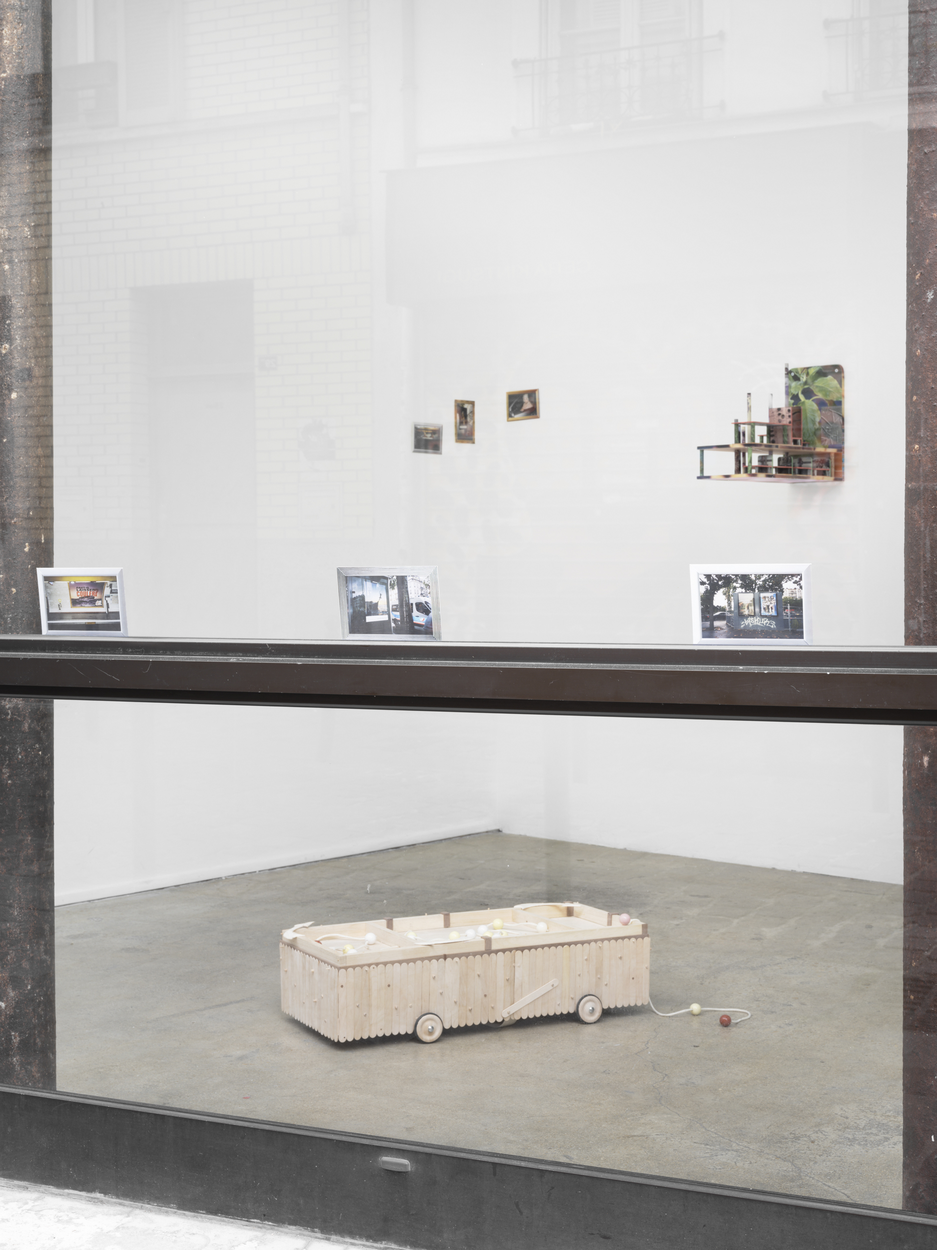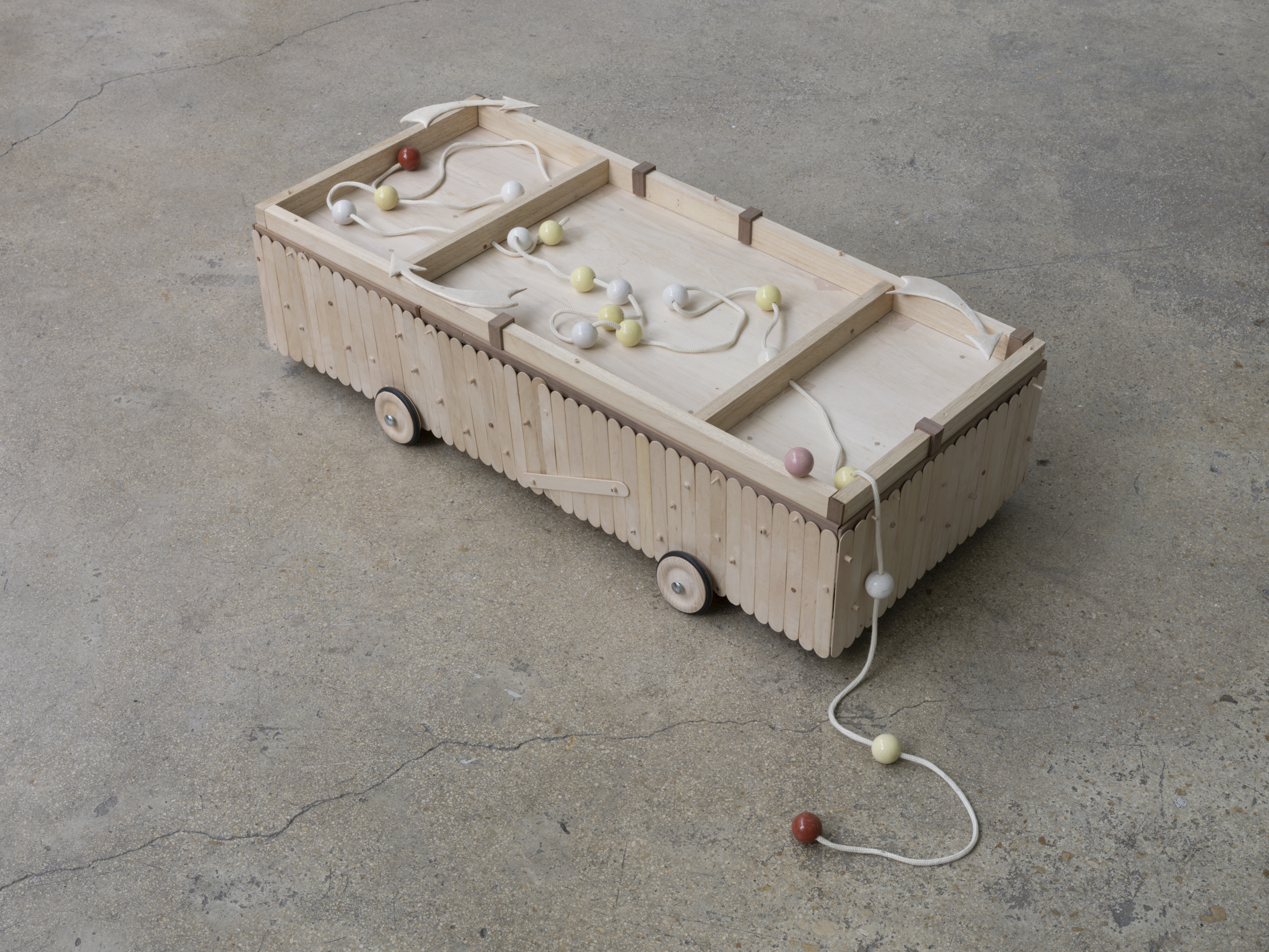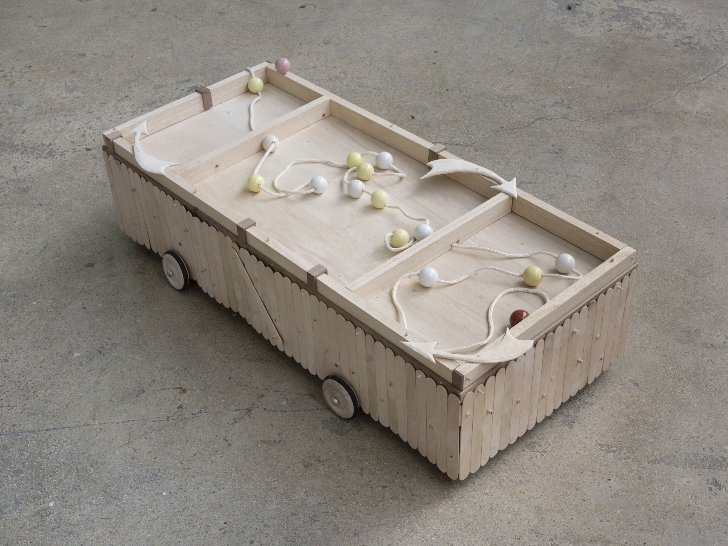 Ice-cream sticks, plywood, obeche and mahogany wood sticks, enamel and acrylic paint on wooden beads, wheels, rope. 35 × 78 × 18 cm