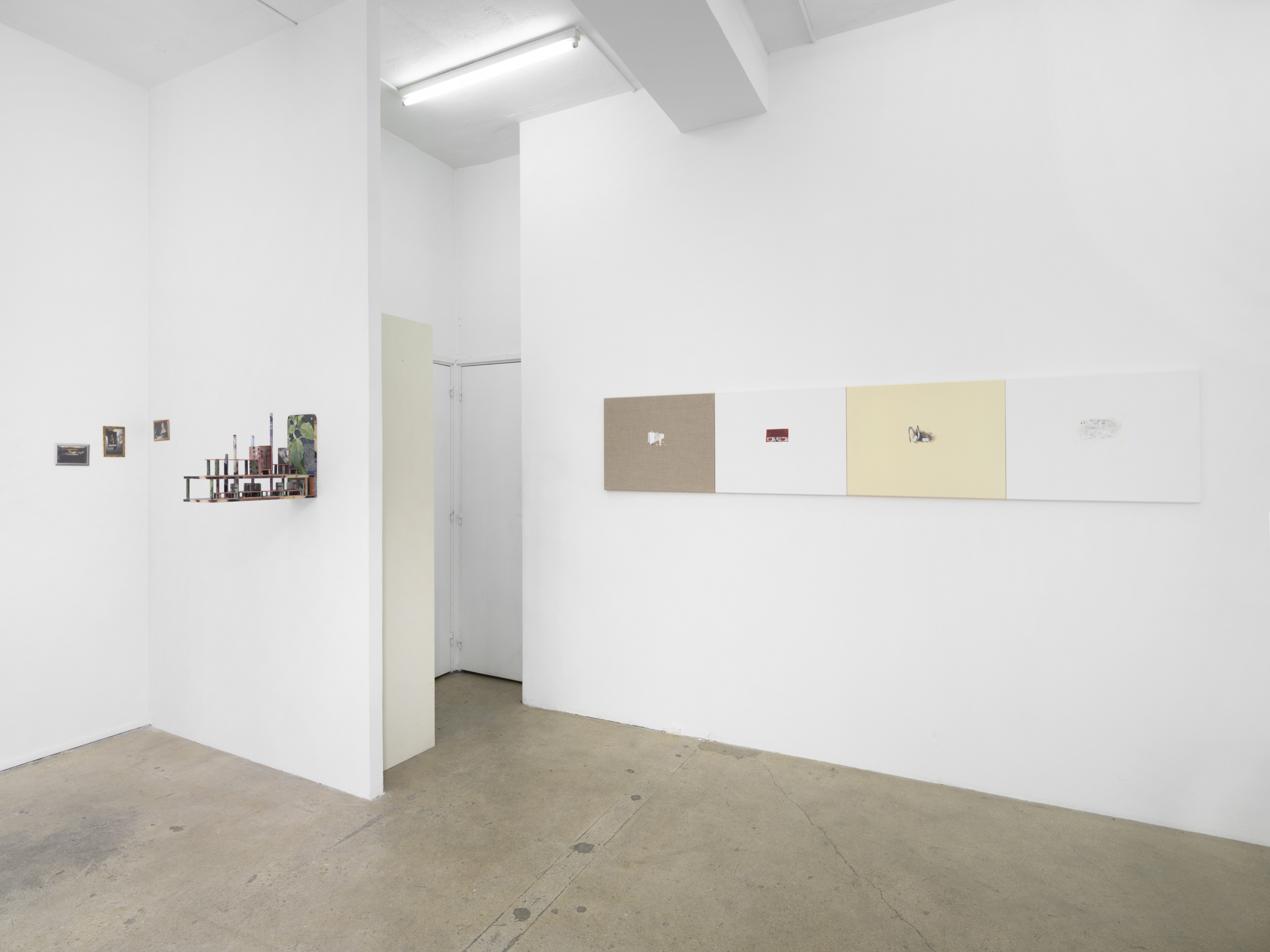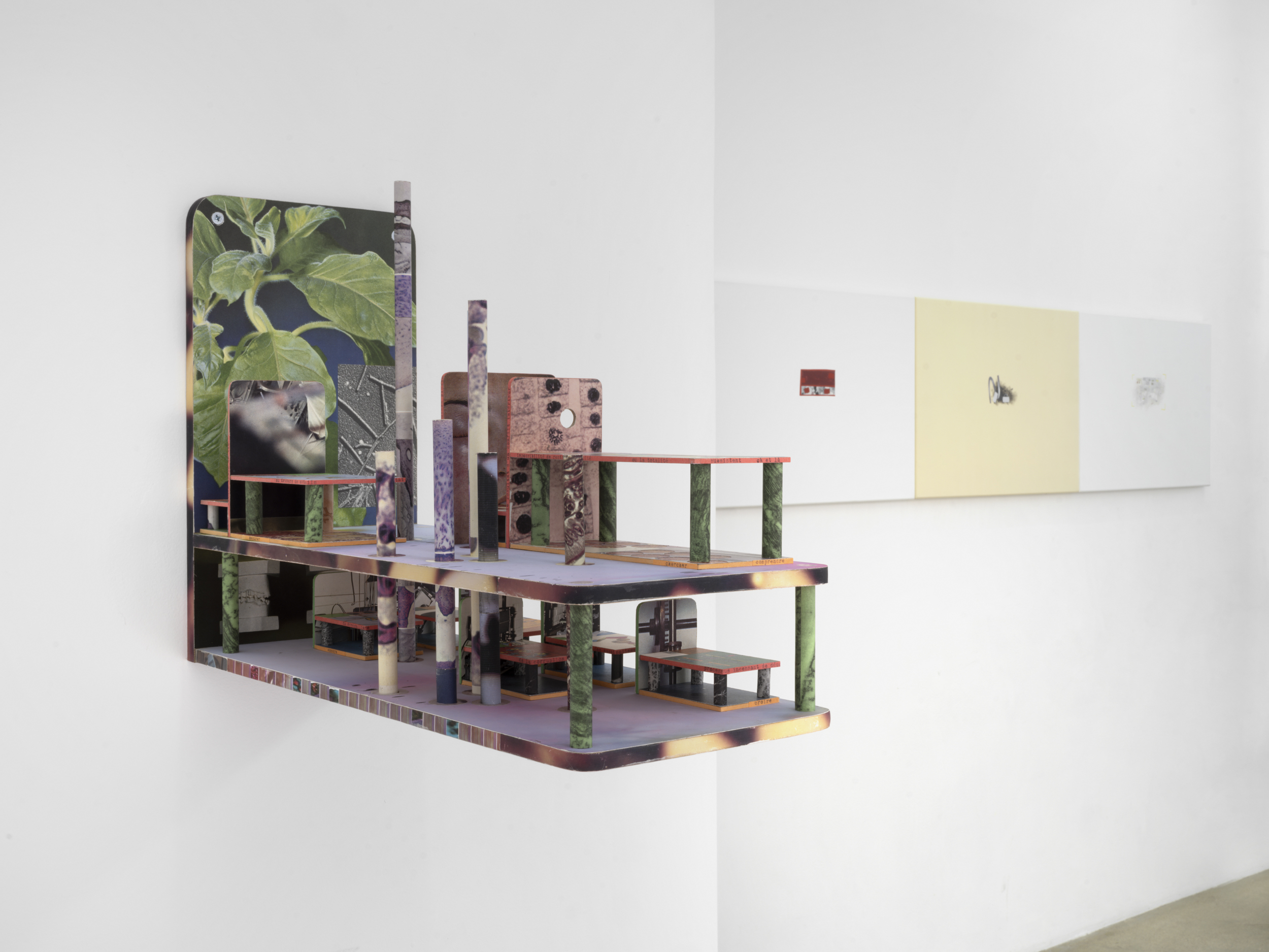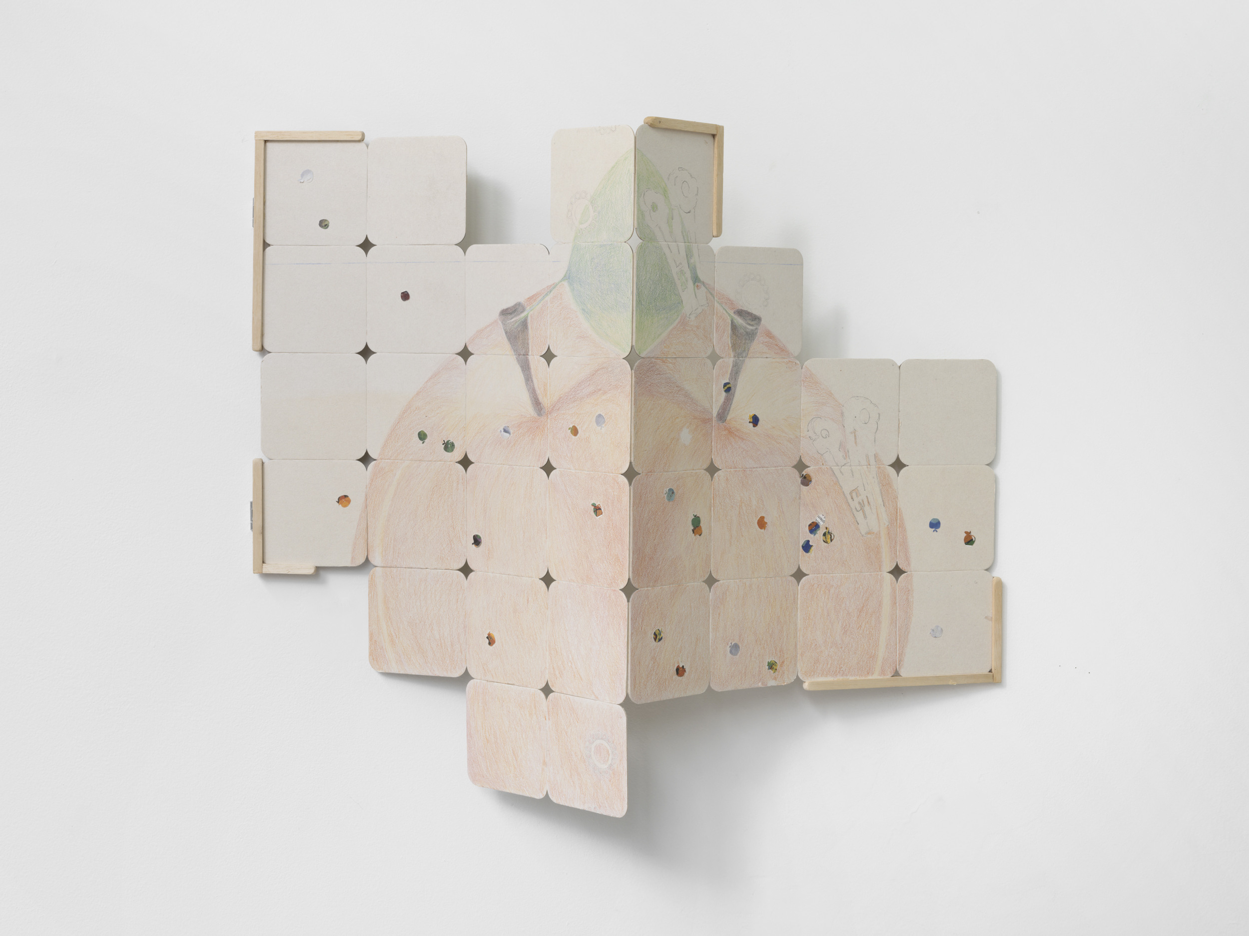 Coloured pencils on beer coasters, apple shaped confetti, tape, obeche wood. 76.4 × 56.2 cm