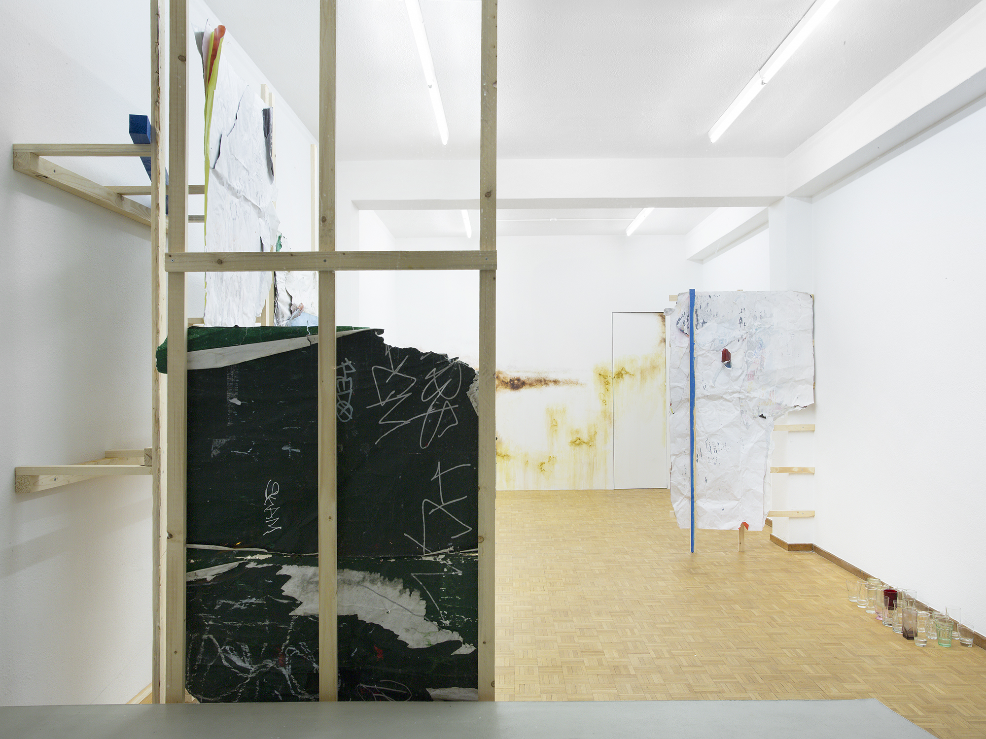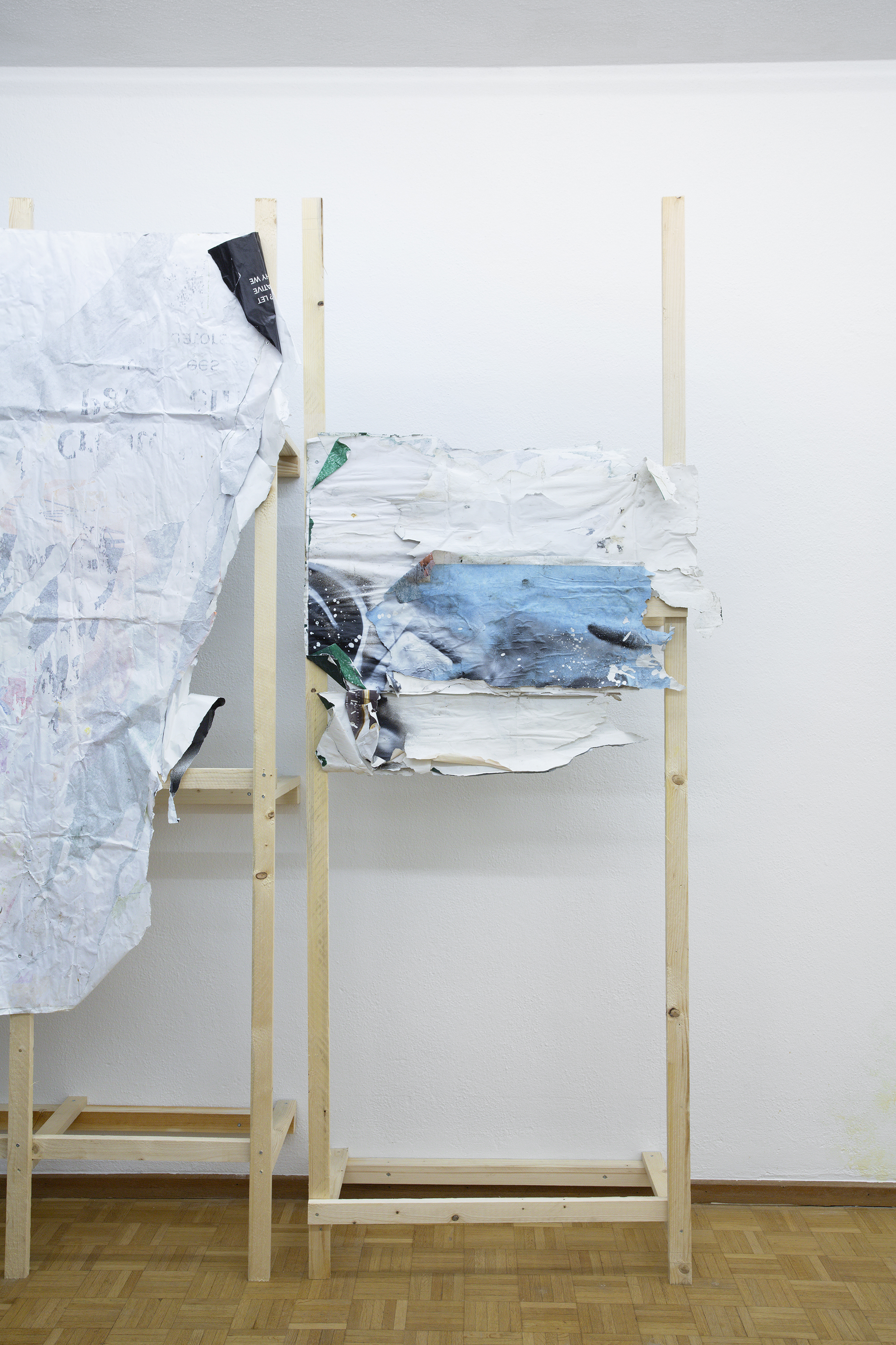 Found paper advertisements, wheat paste, rain water, screws, wood, acrylic latex paint. 250 × 92 × 40 cm