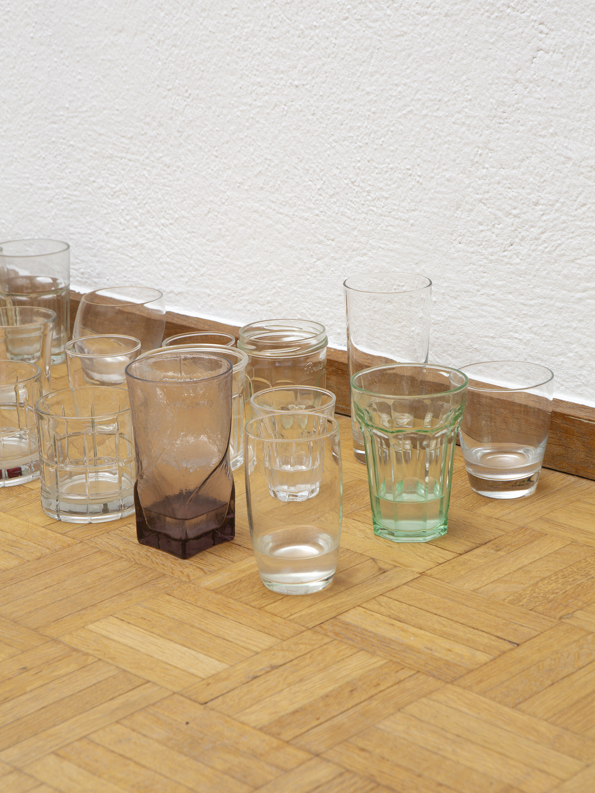Glassware, NYC rainwater (upon evaporation the NYC rainwater is replaced with the one from Zurich). Variable dimensions